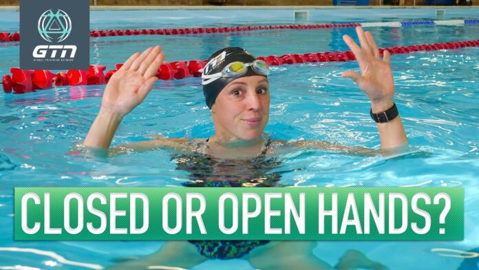 손가락을 모으면 더 빨리 수영할 것만 같습니다. 그러나 여기에 대한 반증은 손가락을 다 펴고 하거나 주먹을 쥐고 하더라도 실제 속도 차이는 크지 않다는 것입니다. 힘은 상체 롤링에서 대부분 나오기에 손바닥은 큰 영향을 주지 않는 다는 것입니다. 특히, 초보자의 경우 어깨와 팔 근육이 제대로 잡히지 않았기 때문에 손가락을 모아봤자 힘을 효과적으로 전달하지 못합니다.