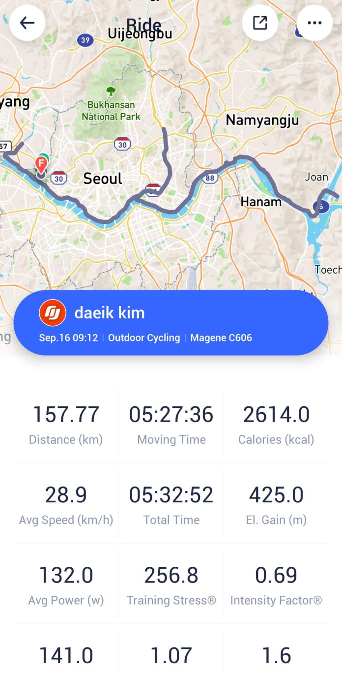 사이클은 처음으로 약 160km를 한번도 쉬지 않고 타봤다. 대회때도 보급 때문에 90km 지점에서 십분이상 쉬었는데 이번에는 처음으로 안장 위에서 시간을 온전히 보냈다.(중간에 화장실 1회, 물통 보급 1회로 5분 정도 멈춘 것으로 확인됨.)