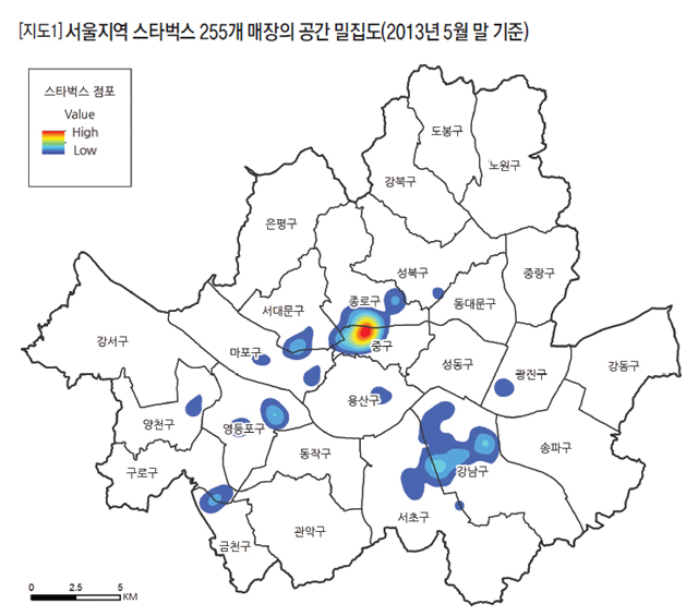 <지도 4>에 표현된 종로·을지로 지역에 스타벅스는 55개 매장을 출점했다. 서울 전체 255개 중 22%에 해당하는 비율이다. 일자리와 지하철 유동객의 규모를 고려할 때 <지도 4> 지역은 서울의 10%에 해당하는 집적도를 보였다. 면적 비율 대비 10배의 밀도라고 하면 스타벅스는 22배의 밀집도를 기록한 것으로 볼 수 있다.