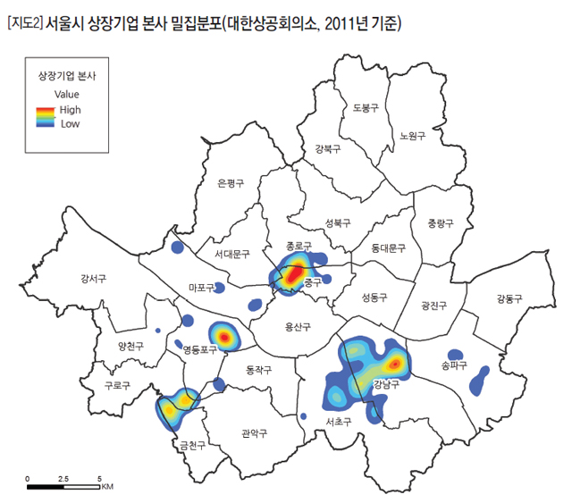 전국의 1710개의 상장회사 중에 서울에만 757개의 본사가 있다. 44%가 서울에 모여 있다. 서울 전역에서 다시 상장기업 본사의 위치를 살펴보자. <지도 2>에서 볼 수 있듯이 4개 지역으로 압축되는데