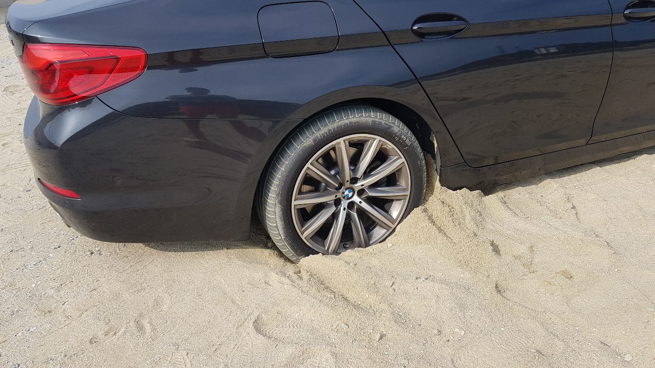 시간 날때마다 가는 인구해변 옆, 우리 전용 낚시터에서 차가 모래에 빠져버렸다. 원래는 위 사진에서 보듯 오른쪽 부분에 자갈이 깔려있어서 차량 이동이 문제없다. 그런데 저날은 우리 차 뒤에 다른 차가 한대 더 주차해서 그 차를 피해 나가려다가 경계선을 넘어선 것이다.