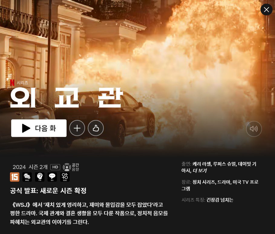 외교관 시즌2는 시즌 1에 이어 인기 많은 시리즈 물이다. <웨스트윙>, <홈랜드> 작가이기도 했던 데보라 칸이 총괄 제작을 했다. 중학교 때 친구가 외교관이 꿈이라고 했던 기억이 났다. 그래서 외교관하면 똑똑한 사람들이 여유있게 해외에서 일하는 단순한 생각이 있었따. 그러나 이 시리즈들을 보면서 외교관은 첩보전의 첨병에 서 있는 중요한 위치임을 알게 됐다. 외교관 > 정보기관 > 군인이 결국 동일 선상임을 알 수 있었다. 그래서 외교 실패가 전쟁으로 이어진다.