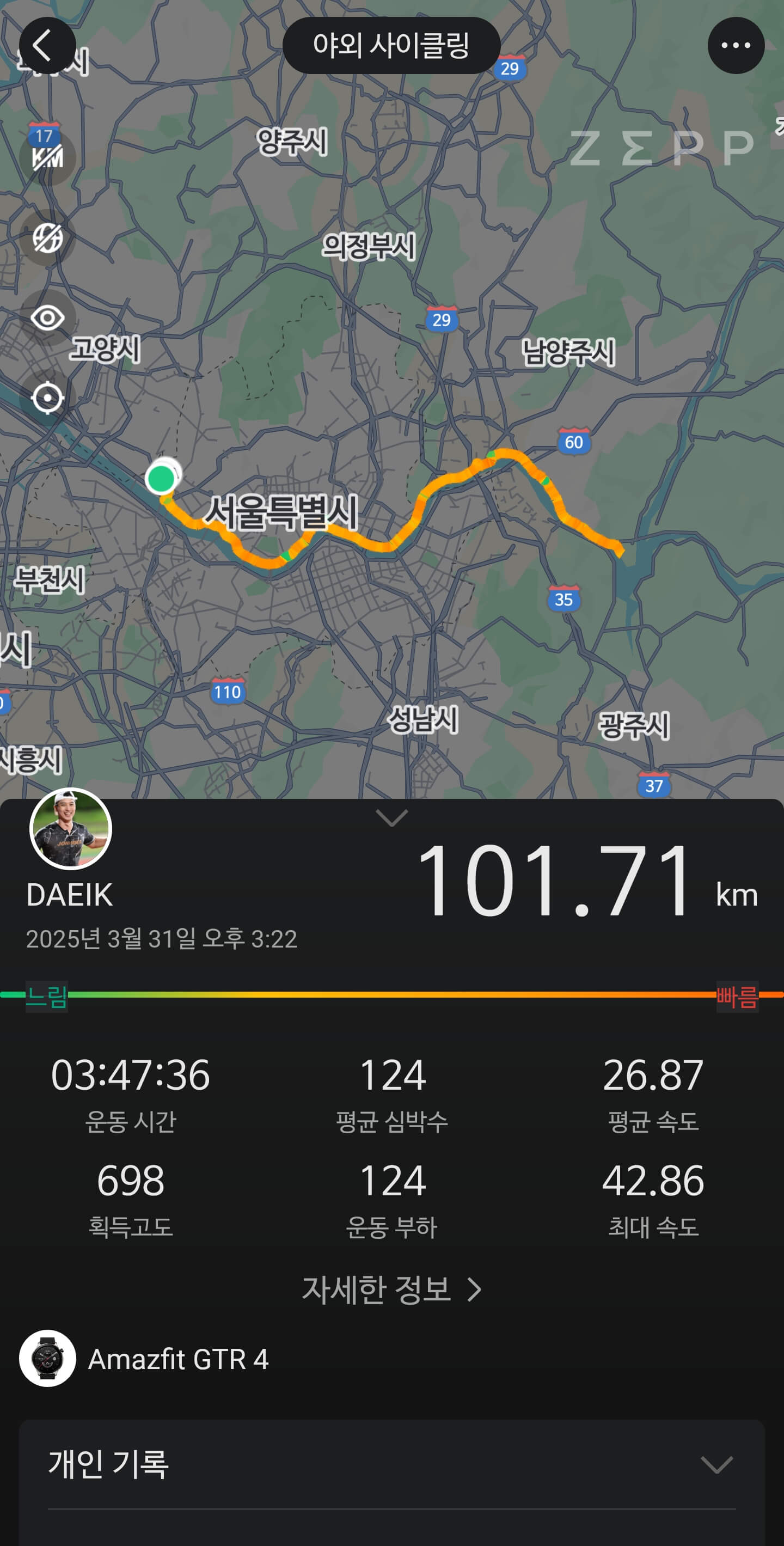 그나마 지난 주 100km 훈련 때는 평속도 제법 올릴 수 있었고, 거리 부담도 확 줄어들었다. 하지만 여전히 피팅 문제가 있었다. 그래서 4월 2일 아침에 강 교수님께 가서 피팅을 받기로 했다. 피팅만 제대로 되면 업그레이드 된 사이클에 몸까지 준비되어 있으니 사이클 기록에 더 욕심을 낼 것 같다.